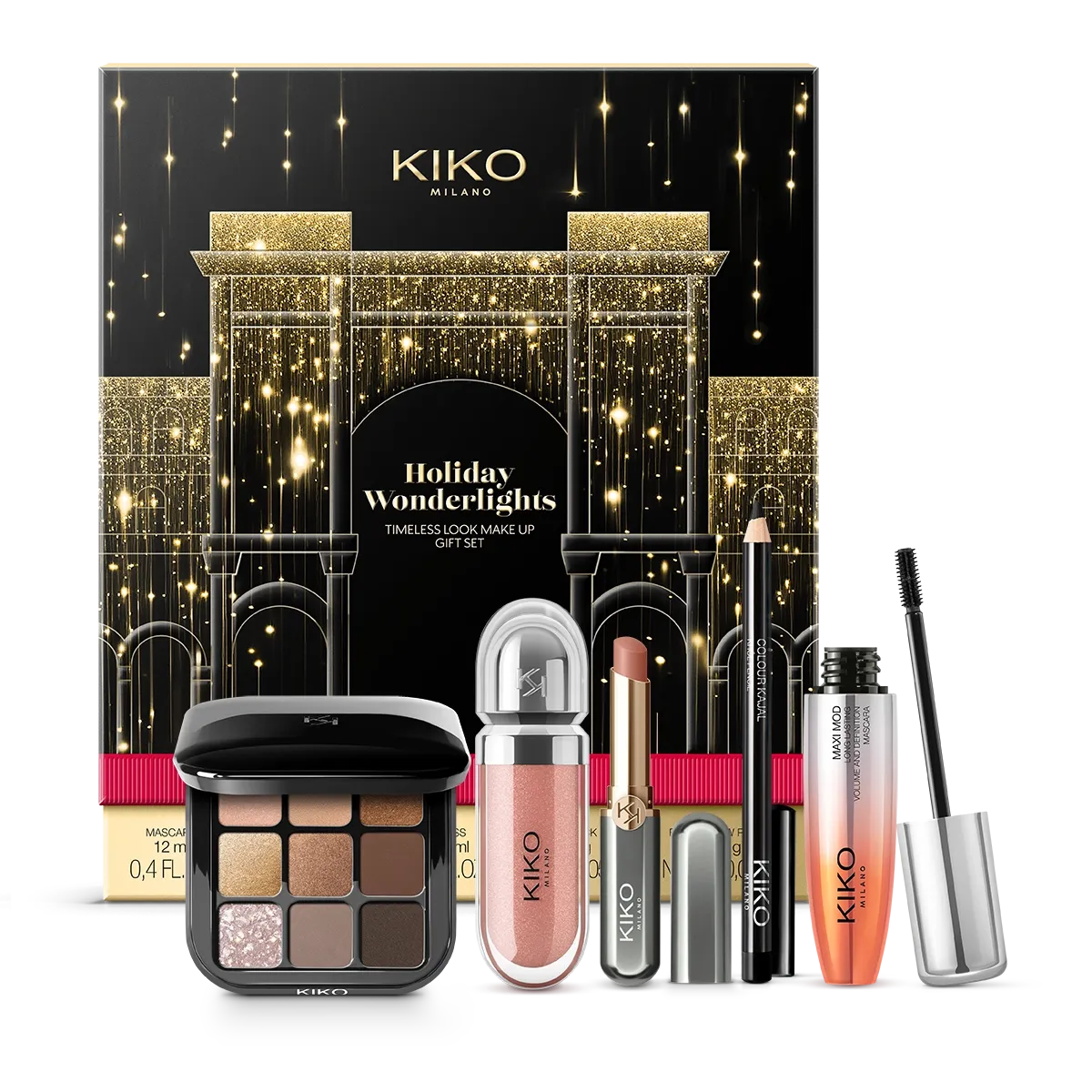 Conjunto de maquiagem para presente composto por um kajal preto, uma máscara de efeito volumizador, uma paleta de sombras, um batom demi-mat e um brilho labial hidratante*, em uma preciosa caixa de presente.O conjunto contém:– No. 1 Colour Kajal 01Lápis kajal com textura macia e cremosa para aplicação na linha d’água do olho. Fórmula fundente e deslizante para uma maquiagem gráfica e precisa, com desempenho de cor intenso e imediato.– No. 1 Maxi Mod MascaraUma máscara icônica com uma miniponta para alcançar até os cílios mais curtos e envolvê-los em uma textura que dá volume e definição.– No. 1 New Glamour Multi Finish Eyeshadow Palette 01Paleta de olhos com 9 sombras superpigmentadas com cores combináveis e um acabamento metálico a aveludado para um olhar magnético.– No. 1 Unlimited Stylo 02Batom cremoso de longa duração* que valoriza os lábios e o sorriso com uma película uniforme, aveludada e aderente. Formulado com uma mistura de ingredientes nutritivos e clinicamente testado para longa duração de até 10h*.– No. 1 3D Hydra Lipgloss 20Uma nova fronteira de luminosidade e conforto para seus lábios. Um produto simplesmente icônico e precioso que hidrata* os lábios, os envolve e os reveste com pura luz para um brilho de efeito 3D.Ideal para:deslumbrar com um look total icônico e glamouroso e surpreender com um presente único.